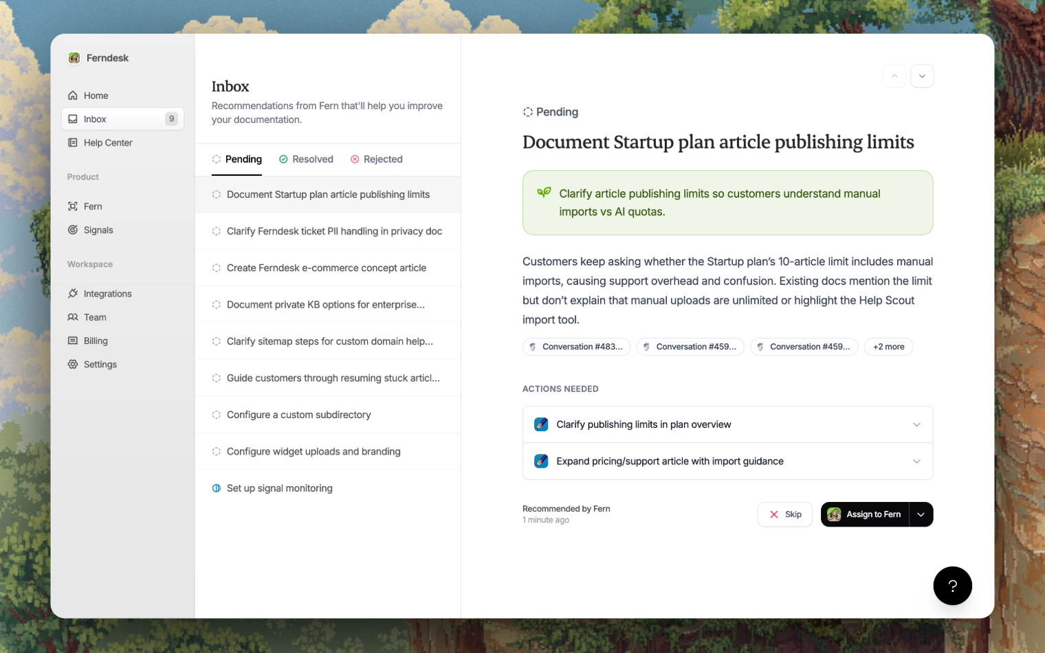 Fern watches your support tickets and product changes to spot gaps in your documentation. Instead of waiting for patterns to become obvious, Fern surfaces them early so you can address issues before they pile up.