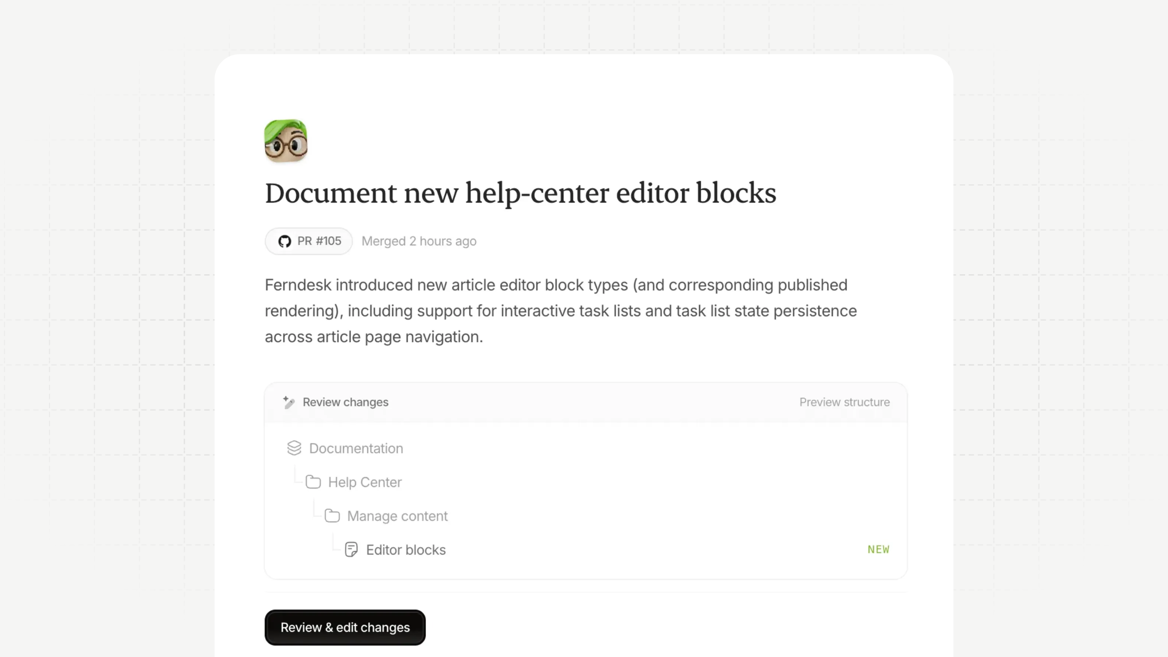 Fern reads the code changes, then drafts an update to your help center. You review, edit, and publish.