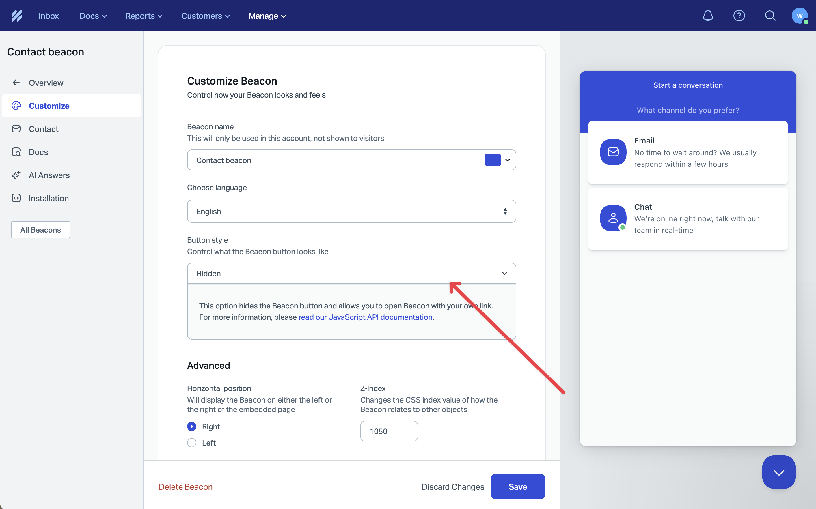 Before you begin: You must have the Help Scout Beacon installed on your site with the button style set to Hidden. If you haven't done this yet, follow the steps below before configuring Ferndesk.